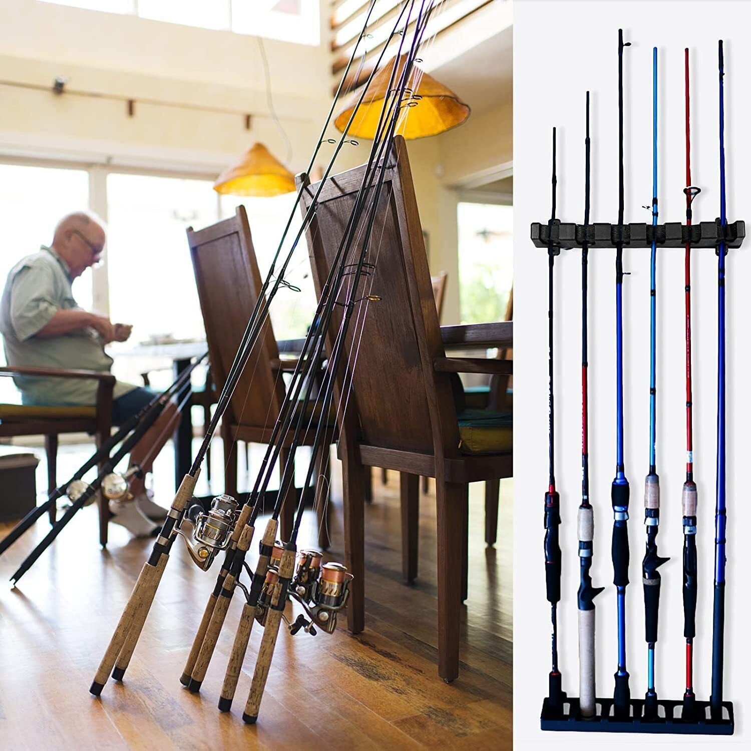 • Secure Fit: The foam insert in the top holders that holds your poles in place, keep them from falling on the ground. This fishing rod rack is must have for anyone looking to get the fishing rods out of the corner and organized.