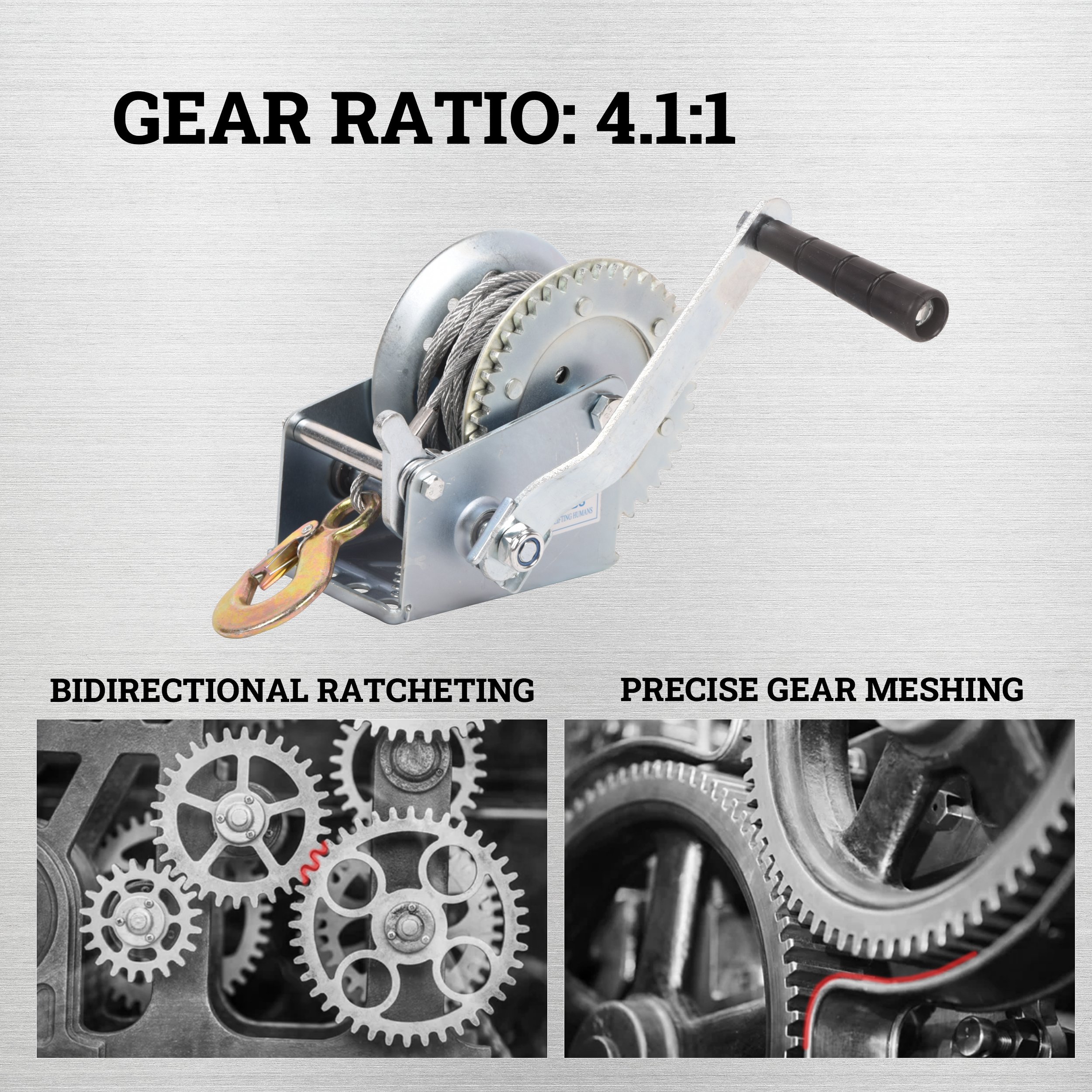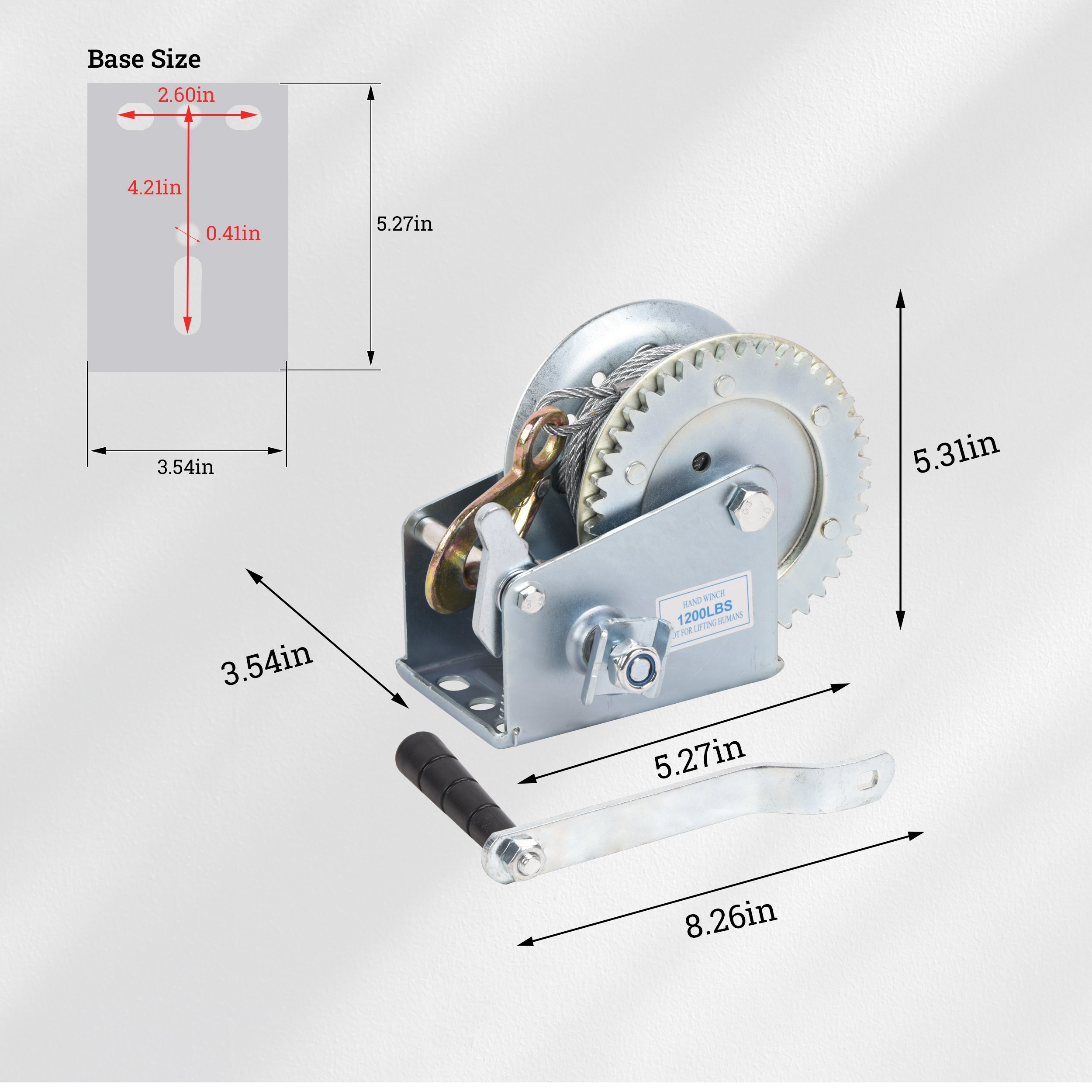 1.LOAD CAPACITY: 1200 LBS hand winch with heavy duty steel hook, gear ratio is 4.1:1, Which reduces labor output and obtains greater traction.